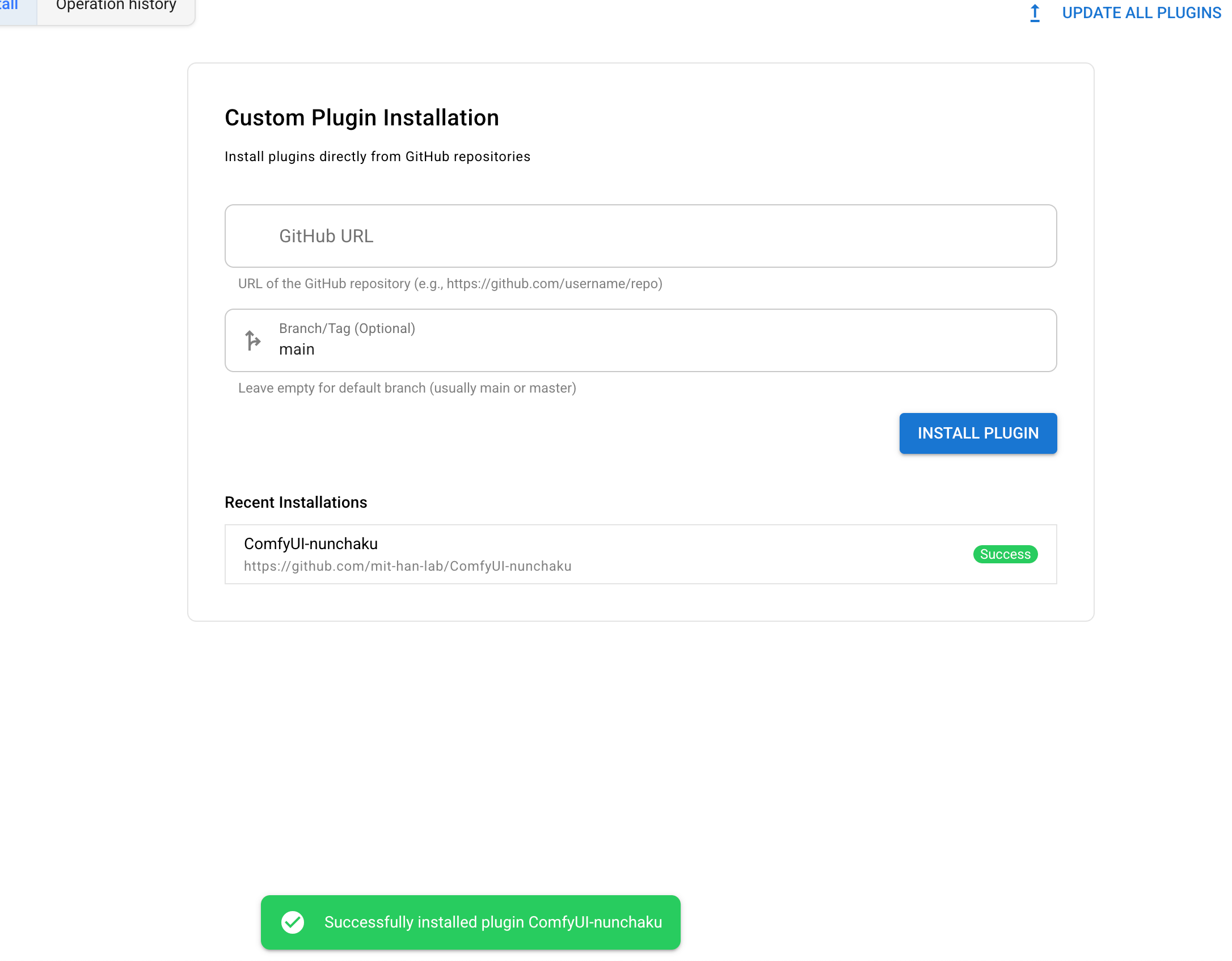 3. 点击 安装插件,看到下面的画面即表示插件安装成功。重启ComfyUI后就可以使用Nunchaku插件了。