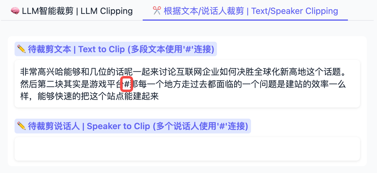 根据说话人裁剪: 输入您想剪辑的说话人。对于多个人,请使用 # 连接(例如: