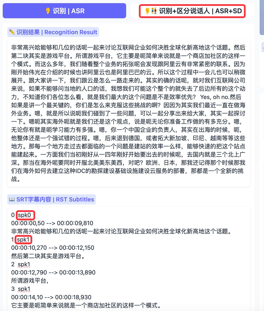 区分说话人(可选): 如果您需要根据说话人剪辑,点击“识别+区分说话人”。这将生成包含说话人信息的语音转文字内容和 SRT 字幕。