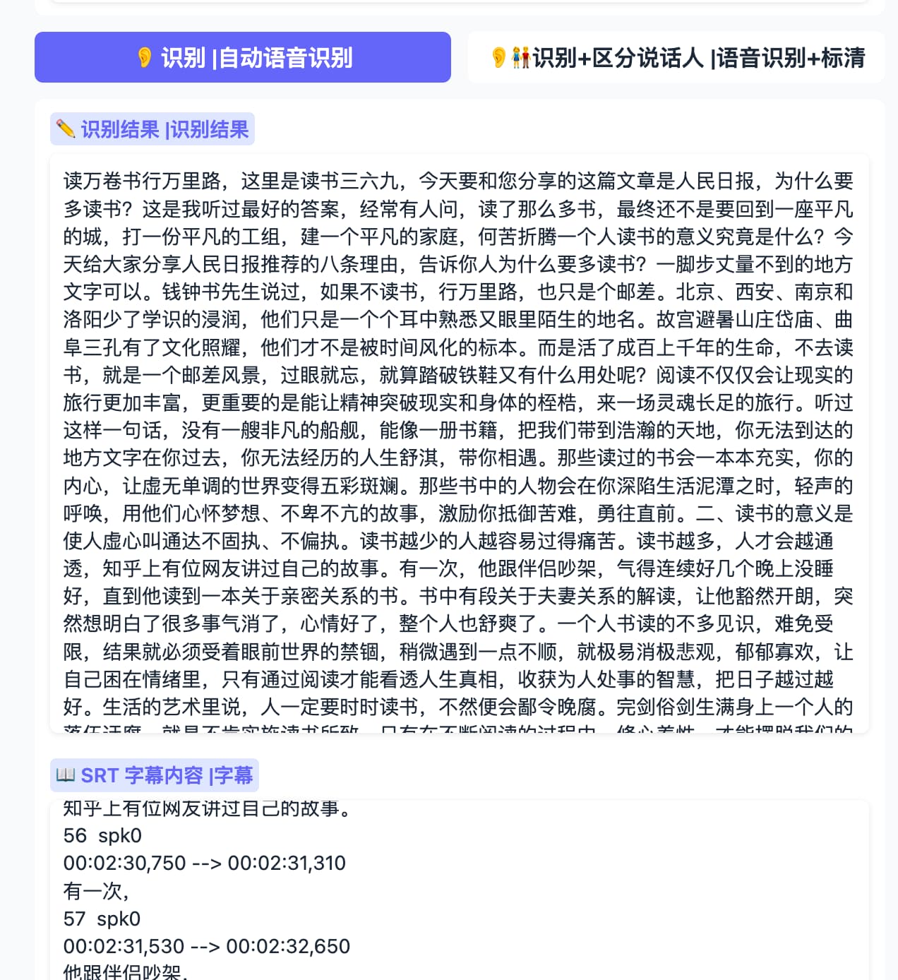 识别: 点击“识别”按钮以获取语音转文字内容和 SRT 字幕文件。