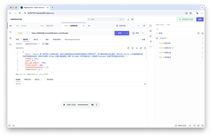 在 Olares 上使用 Hoppscotch 调用 Duix.Avatar 的系列 API,完成模型训练、音频合成和视频合成。