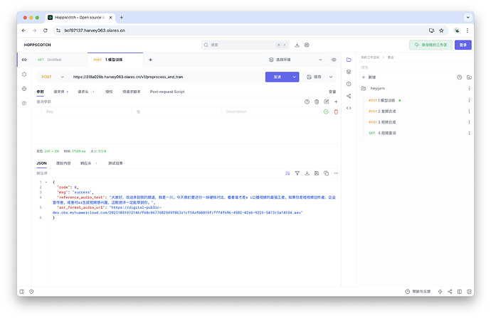 请求成功后,你会收到一个 JSON 格式的响应。响应中的reference_audio_text和asr_format_audio_url字段的值,它们将在下一步“音频合成”中使用。