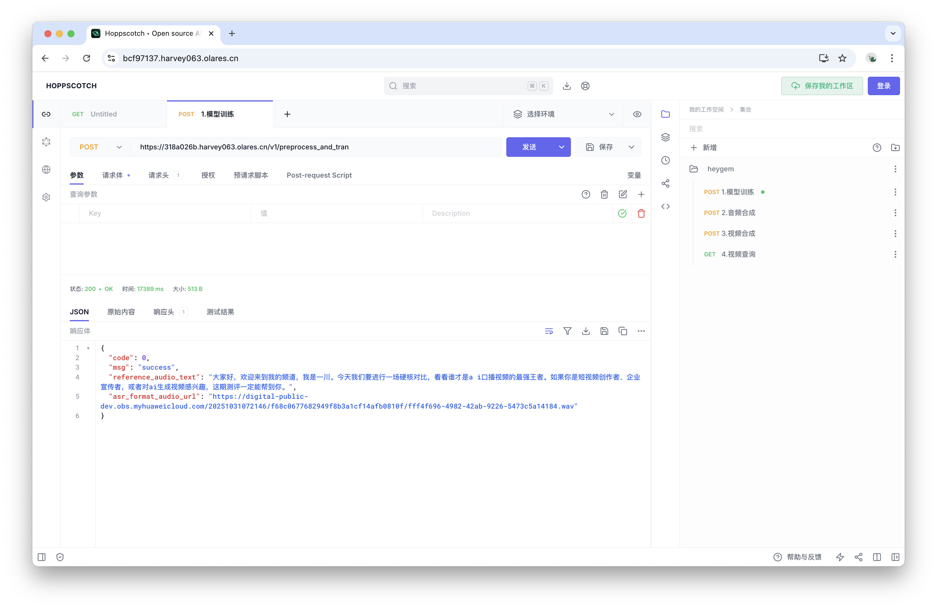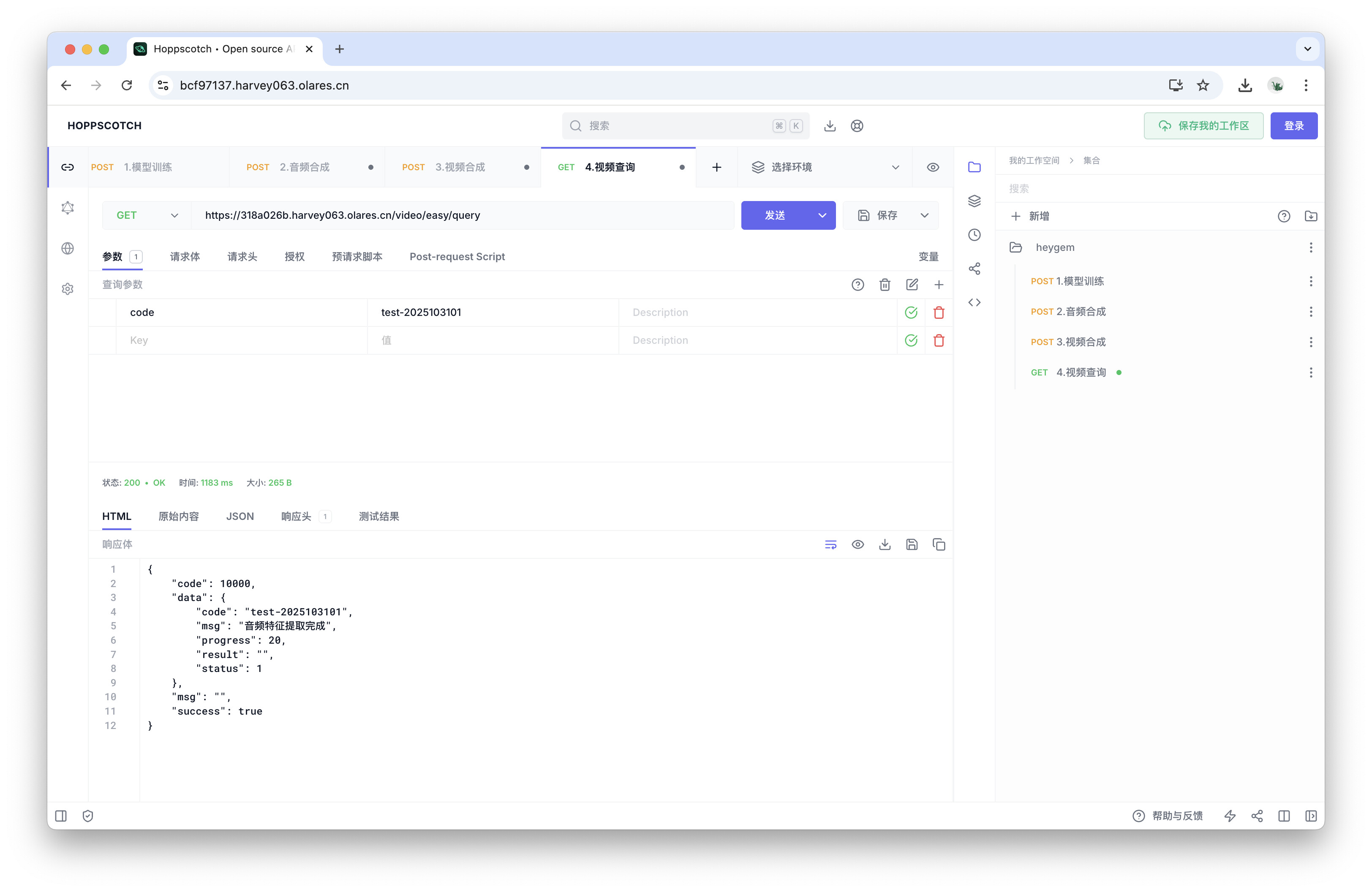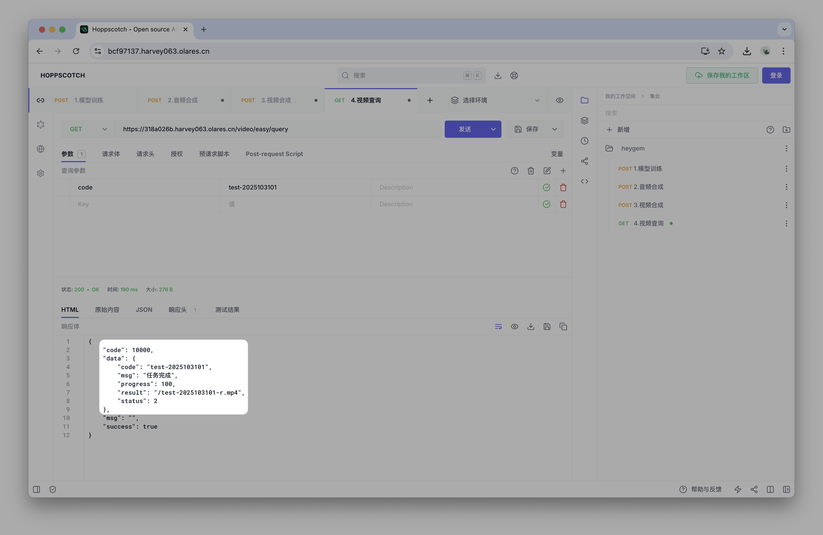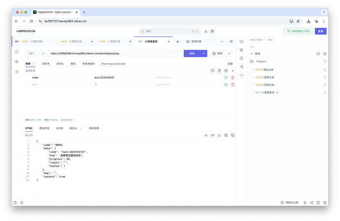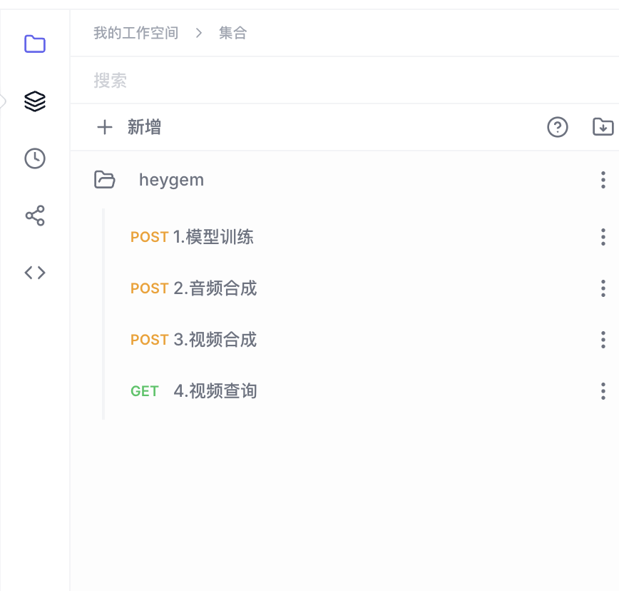 导入后,你将在右侧看到名为heygem的 API 集合,其中包含了四个预设的请求。