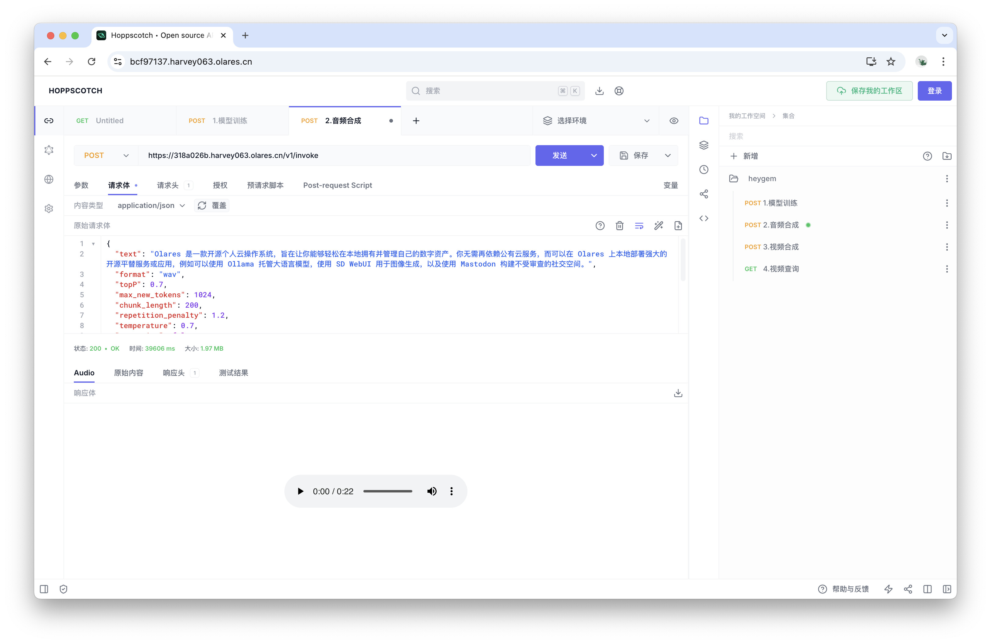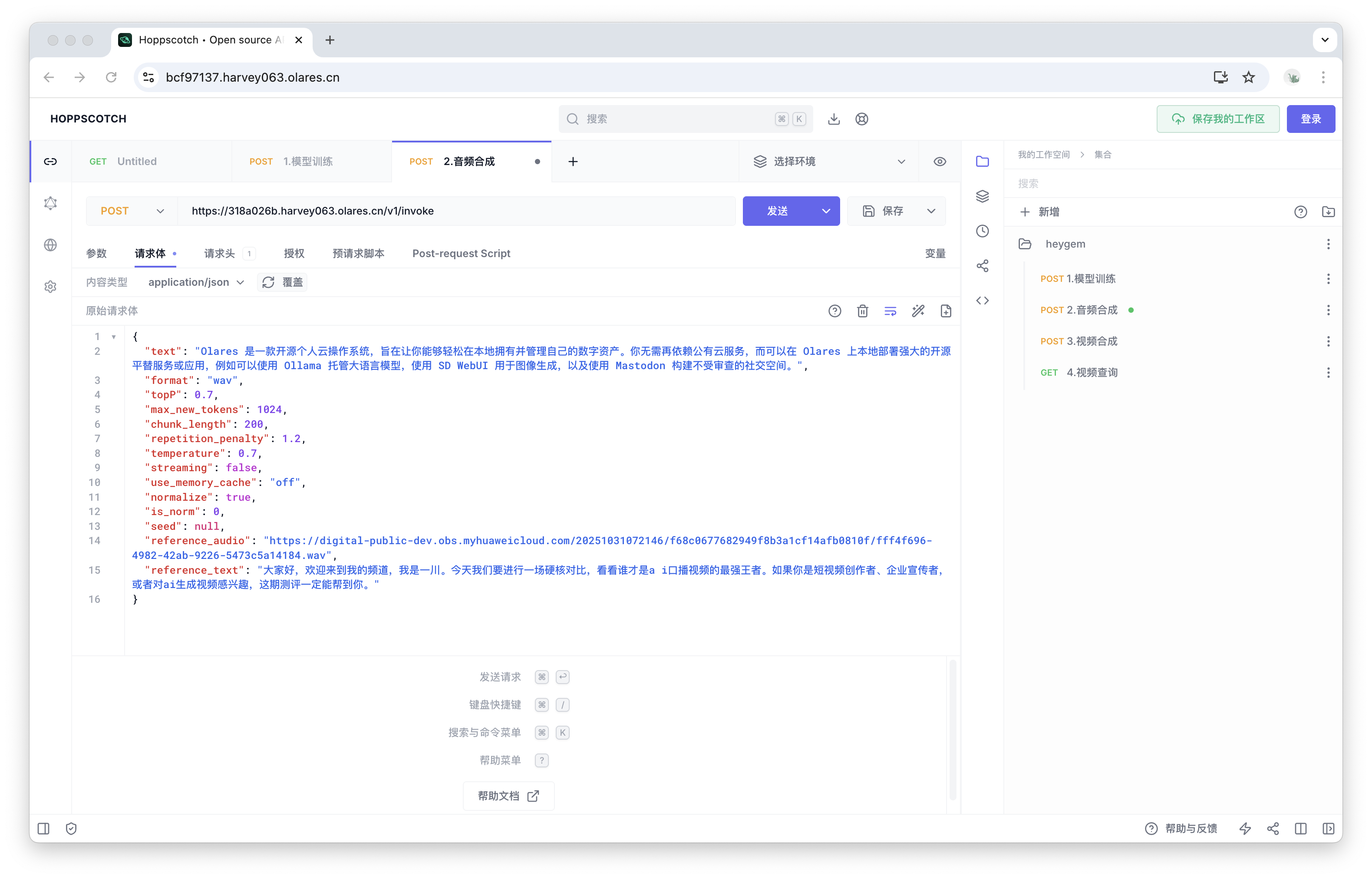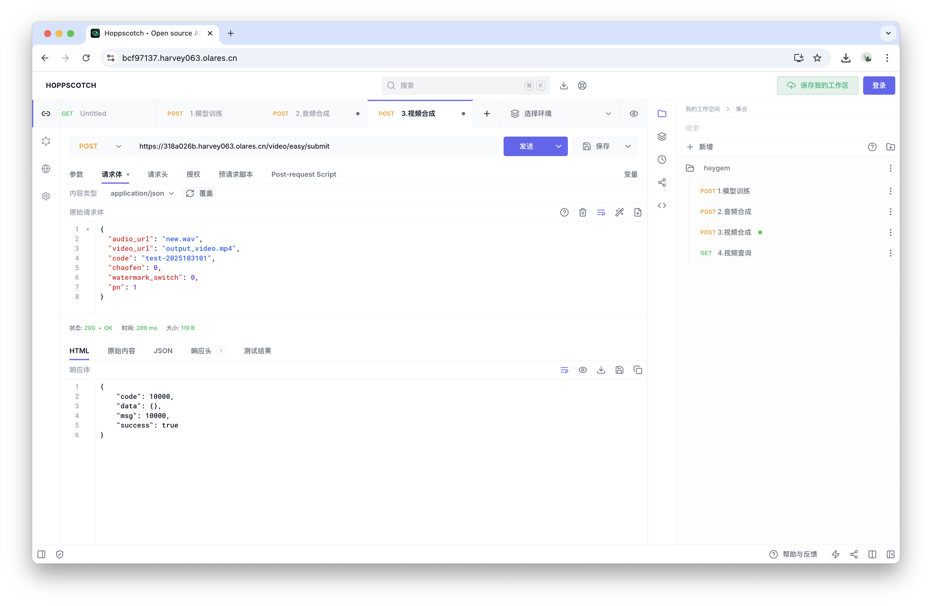 导入后,你将在右侧看到名为heygem的 API 集合,其中包含了四个预设的请求。