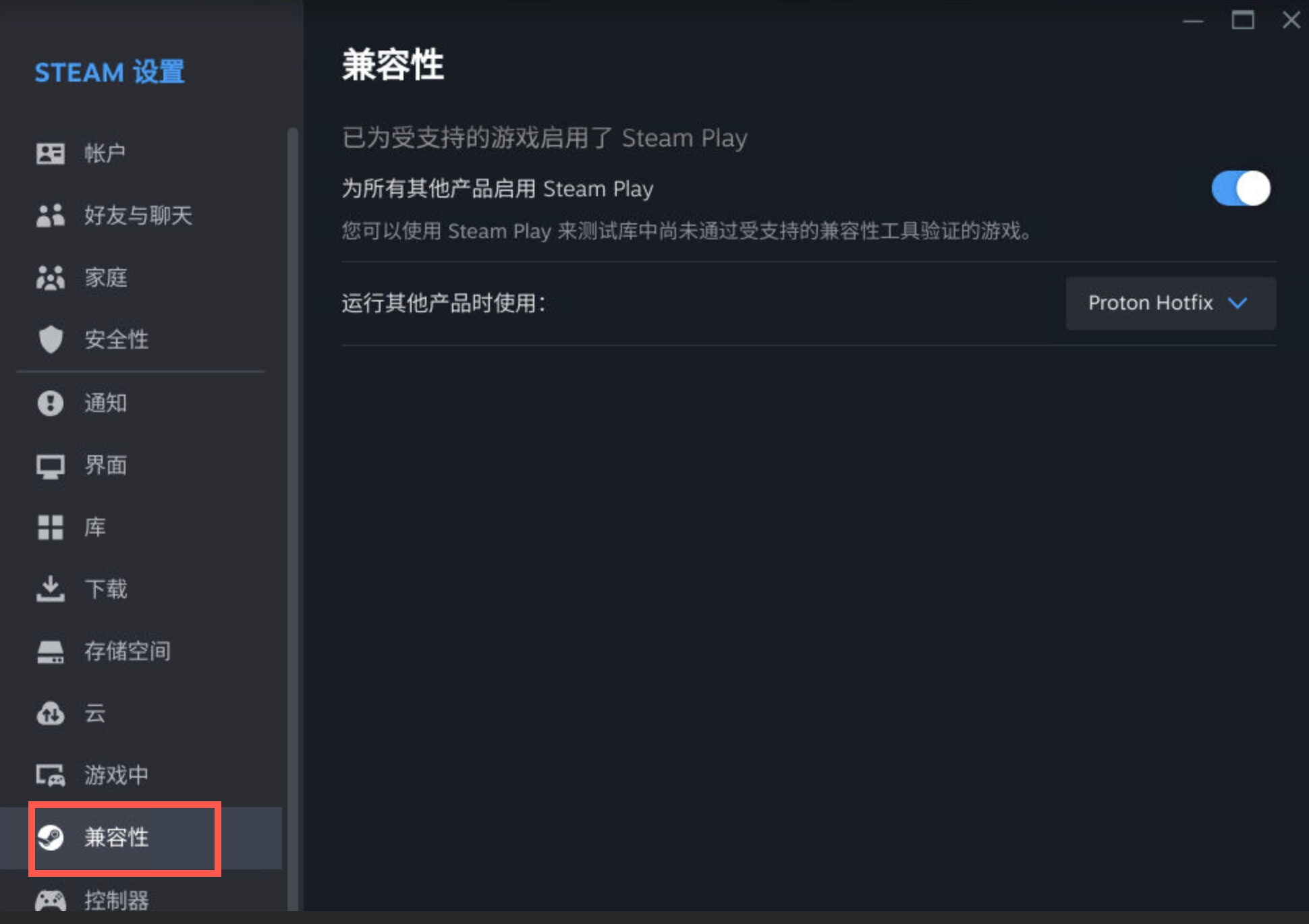 前往 兼容性 选项,勾选为所有其他产品启用 Steam Play。