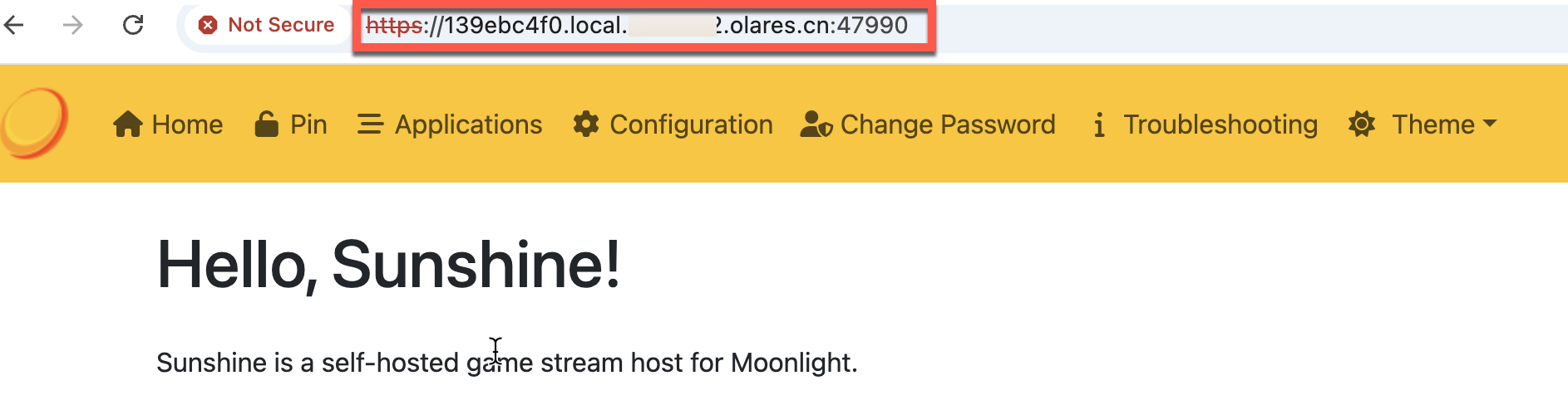 :47990,如https://139ebc4f0.local.<你的olares ID>.olares.cn:47990。通过该网址访问 Sunshine 串流服务器的控制页面。 -