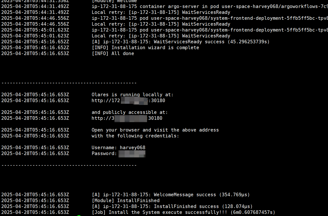 输入后回车即可,系统将继续完成剩下安装步骤,直至显示如下日志时代表安装成功